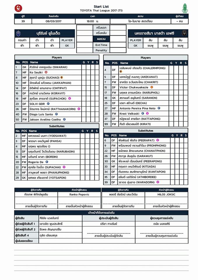 ประกาศ 11 ตัวผู้เล่น บุรีรัมย์ – สวาทแคท ก่อนเกม 18.00 น. ไทยลีก 2017 08-03-2017